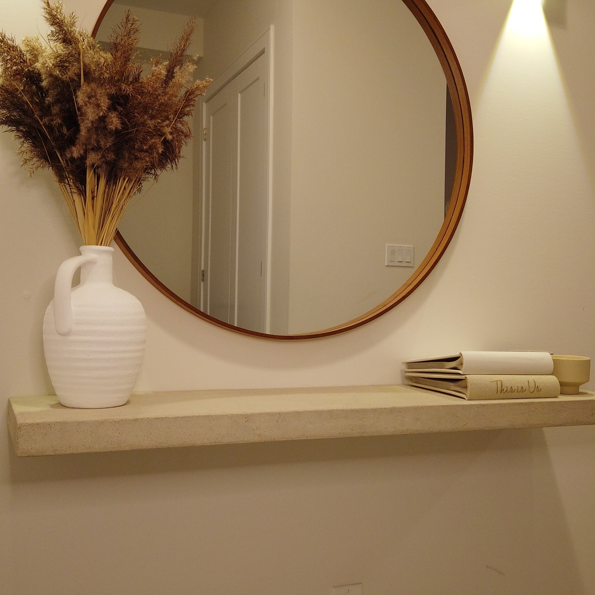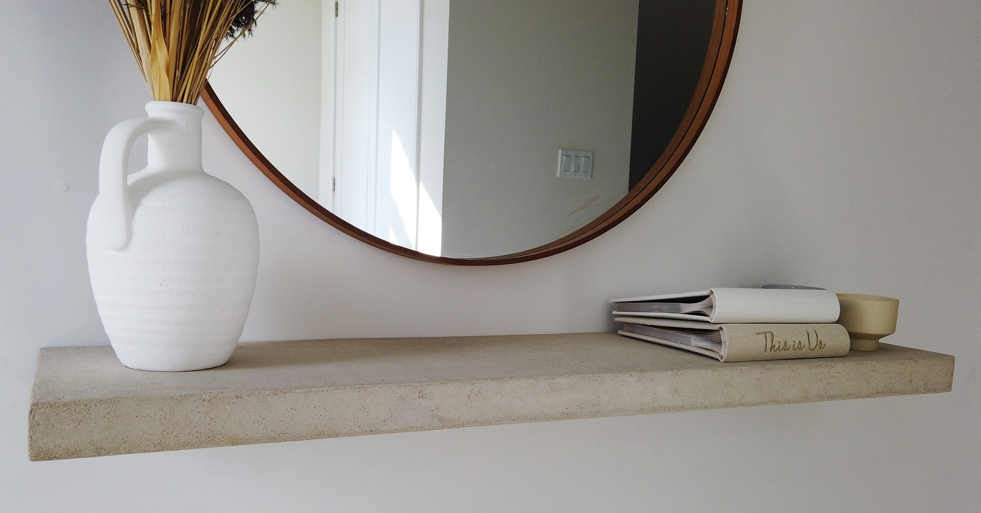 A sculptural floating shelf finished in hand-troweled micro-cement and sealed with a matte protective coating. Designed to bring refined texture and warm minimalism into modern interiors.
